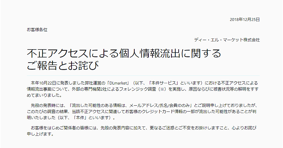 2018年10月17日、サーバーの不具合を受けてディー・エル・マーケットが調査を行ったところ、管理画面への不正アクセスによって、顧客情報の一部(メールアドレス・氏名・会員ID)が流出している可能性が発覚した。