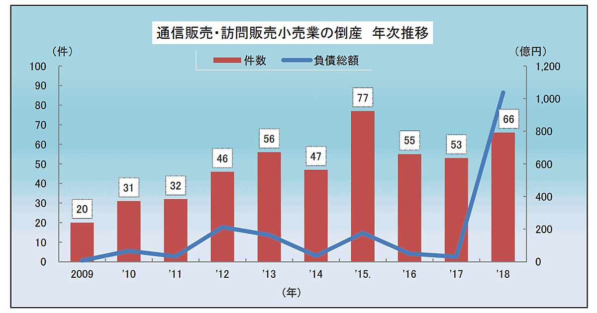東京商工リサーチによると、2018年1~12月における通信販売や訪問販売を手がける小売企業の倒産件数は、前年比24.5%増の66件だった。調査を開始した2009年以降、年次ベースでは2015年の77件に次いで2番目に多い。