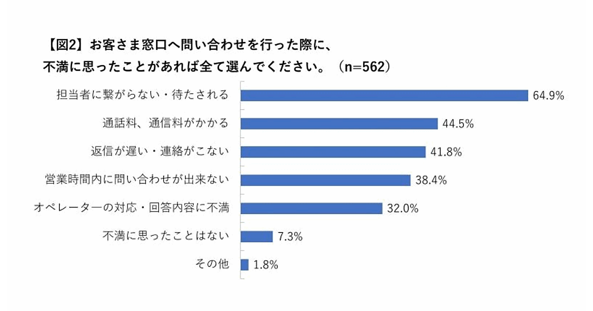 顧客対応の手段として使われる電話や問い合わせフォーム、メールなどに関する不満を質問した(選択式・複数回答)。1位は「担当者に繋がらない・待たされる」(64.9%)、次いで「通話料、通信料がかかる」(44.5%)、「返信が遅い・連絡がこない」(41.8%)、「営業時間内に問い合わせが出来ない」(38.4%)、「オペレーターの対応・回答内容に不満」(32.0%)、「不満に思ったことはない」(7.3%)となっている。