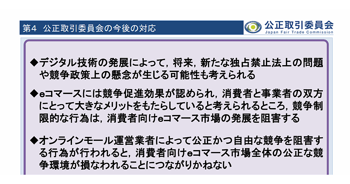 公正取引委員会としては、消費者向けeコマース取引の動向について、特にオンラインモール運営業者による行為を中心に、情報収集に努めるとともに、独占禁止法に違反する行為に対しては厳正に対処していく(1月29日「消費者向けeコマースの取引実態に関する調査について」)