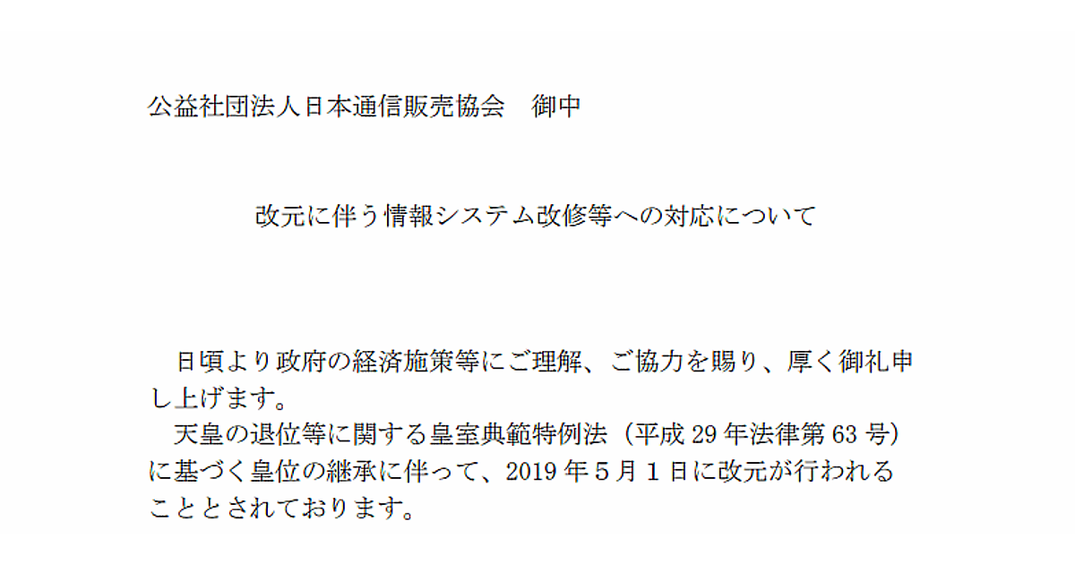 公益社団法人日本通信販売協会(JADMA)は1月30日、2019年5月の改元に伴う情報システム改修などへの対応例を記載した文書を公表した。同文書は経済産業省が作成、JADMAなど関連団体に周知を呼びかけている。