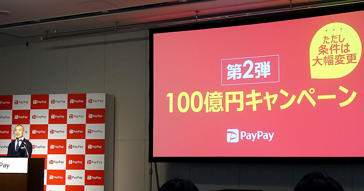 QRコード決済サービス「PayPay(ペイペイ)」を提供するソフトバンクとヤフーの共同出資会社PayPayは、2018年12月に実施した「100億円あげちゃうキャンペーン」に続き、「第2弾 100億円キャンペーン」を、2月12日から実施すると発表した。期間は5月31日までで、付与額が100億円に達した時点で終了する。第2弾は1回のユーザーへ還元する上限額を1,000円、1人あたりの上限額を合計5万円までとした。「多くのお客さまに毎日使っていただくのが目的」としている。