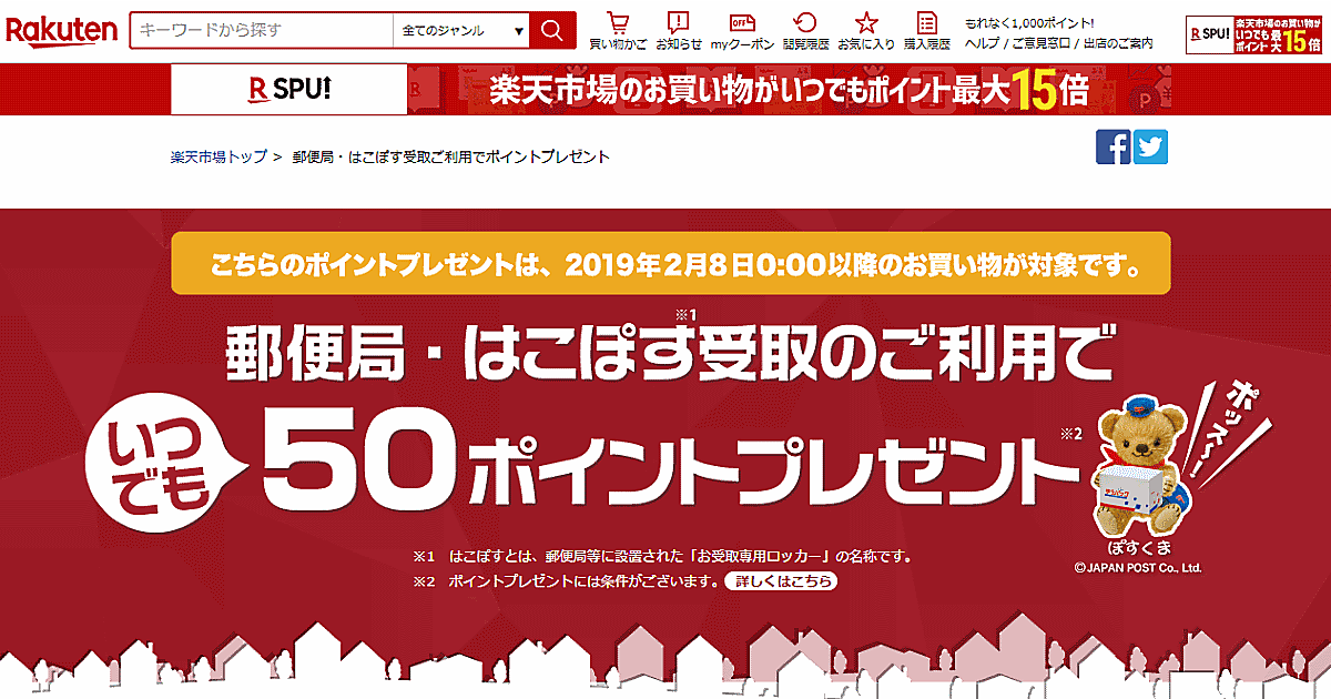 2月8日以降、「郵便局・はこぽす受取サービス」で荷物を受け取ったユーザーに「楽天スーパーポイント」50ポイントを付与する。