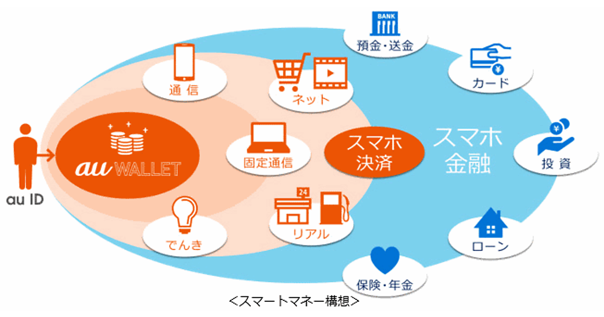 KDDIは、スマートフォンを軸に「預金」「決済」「投資」「ローン」「保険」などの決済・金融サービスを提供する「スマートマネー構想」に着手した。