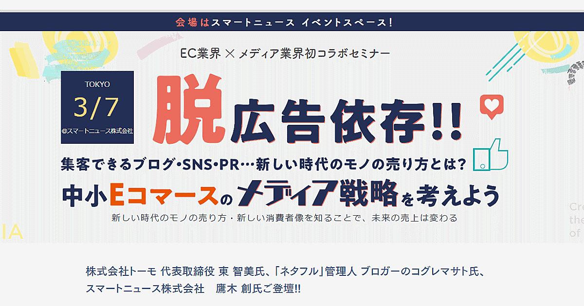 ▼セミナー「脱広告依存!! 集客できるブログ・SNS・PR…新しい時代のモノの売り方とは? 中小Eコマースのメディア戦略を考えよう 新しい時代のモノの売り方・新しい消費者像を知ることで、未来の売上は変わる」について