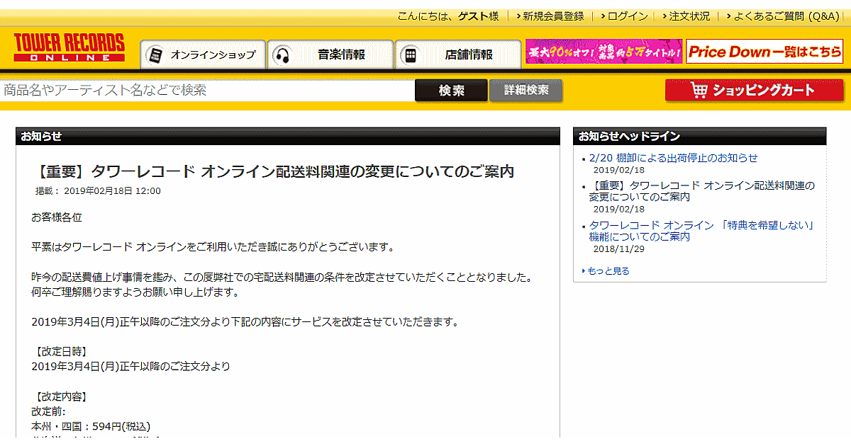 タワーレコードは2月18日、配送費用が値上がりしていることを受け、通販サイト「タワーレコード オンライン」の送料を改定すると発表した。3月4日正午以降の注文は、全国一律216円とする。購入金額2000円以上で送料が無料になるキャンペーンは同日で終了する。
