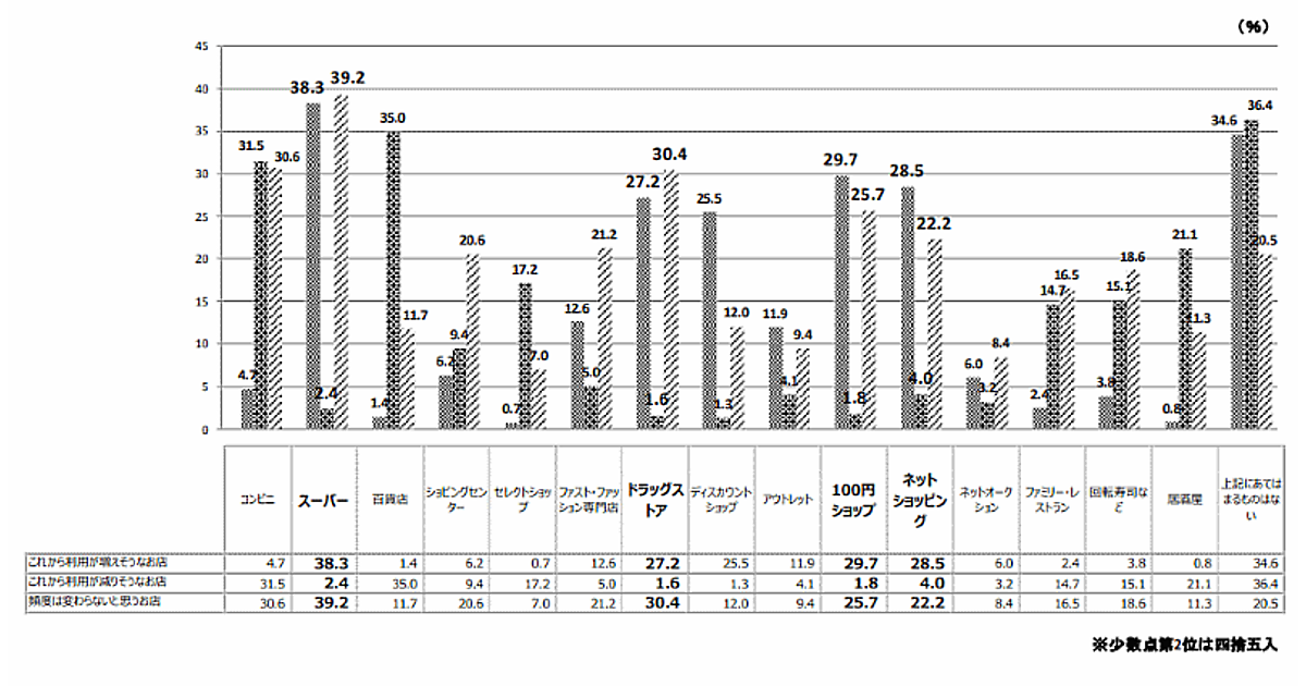 逆に、「これから利用が減りそうなお店」と回答した消費者の割合が高かったのは「コンビニ」(31.5%)や「百貨店」(35.0%)。