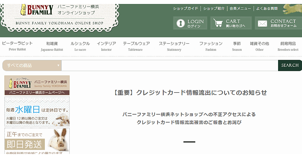 うさぎ関連商材などを販売しているB.F.Yokohamaは2月12日、飼育用品やうさぎをモチーフにした雑貨などを扱っているECサイト「バニーファミリー横浜ネットショップ」から、顧客のクレジットカード番号など241件が流出した可能性があると発表した。