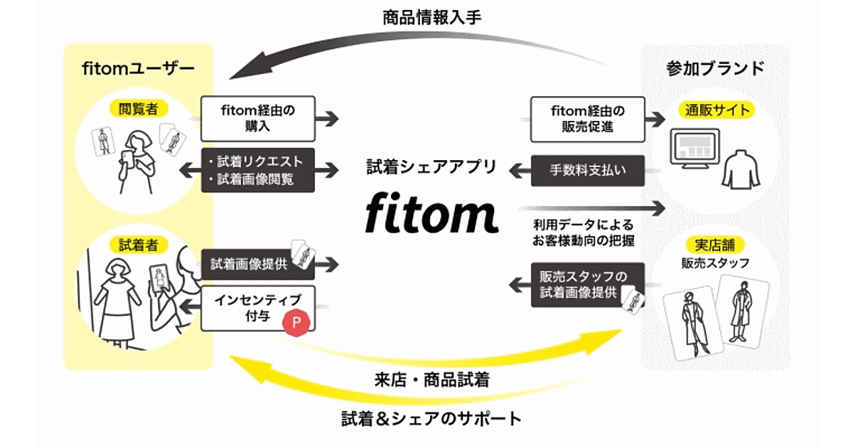 「fitom」のユーザーは、ネット通販などで気になる商品を見つけた際、その商品の試着画像を「fitom」でリクエスト。別のユーザーが実店舗で当該商品を試着し、写真を「fitom」に投稿するとポイントを獲得できる。