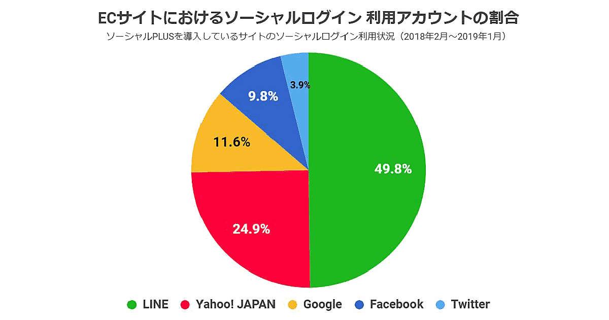 Webサイトにソーシャルログイン機能を実装するASPサービス「ソーシャルPLUS」を使い、「LINE」「Yahoo! JAPAN」「Facebook」「Twitter」「Google」のソーシャルログインを実装しているECサイトを対象にソーシャルログインの利用状況を調査した。調査期間は2018年2月から2019年1月。