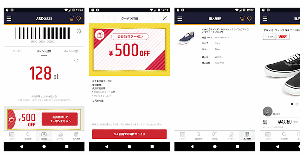 「ABC-MART」のアプリには、実店舗とオンラインストアで共通ポイントがたまる会員証機能などを実装している