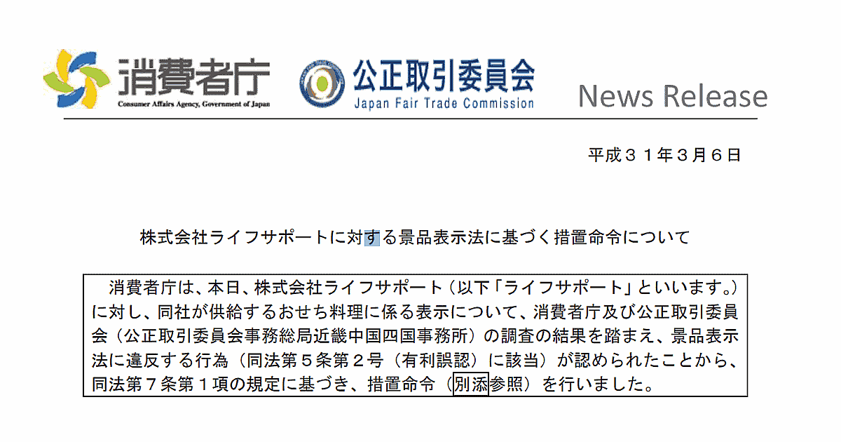 消費者庁は3月6日、通販サイトで販売したおせち料理7商品において、実際よりも安い価格であるかのように表示したのは景品表示法に違反するとして、ラジオ通販などを手がけるライフサポートに再発防止策を求める措置命令を出した。
