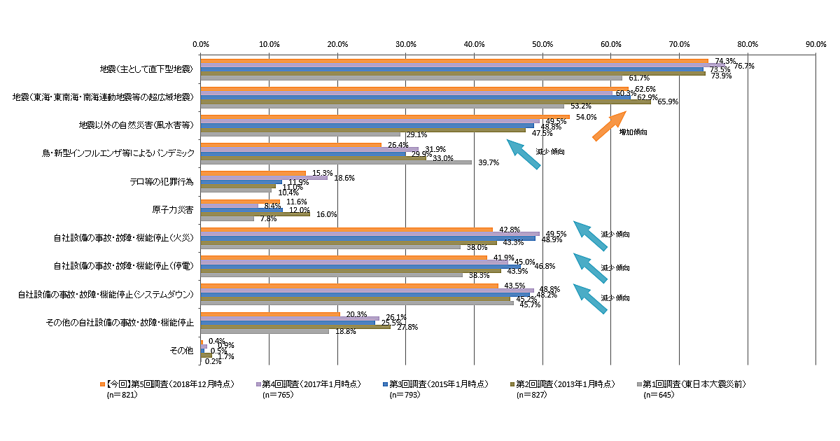 火災や停電、システムダウンなど、自社設備の停止リスクを想定している企業は、それぞれ約4割だった。