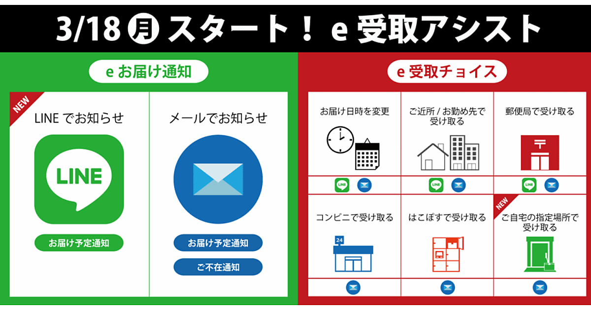 LINEやメールで配送予定を通知する「eお届け通知」と、「eお届け通知」から配送日時や受取方法を変更できる「e受取チョイス」を導入。2つのサービスを総称して「e受け取りアシスト」として展開する。