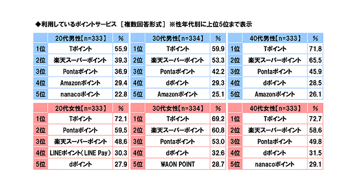 また、「Amazonポイント」は男性の20代・30代・40代でそれぞれ上位5サービスにランクインしているが、女性ではランキング上位5サービスに入っていない。