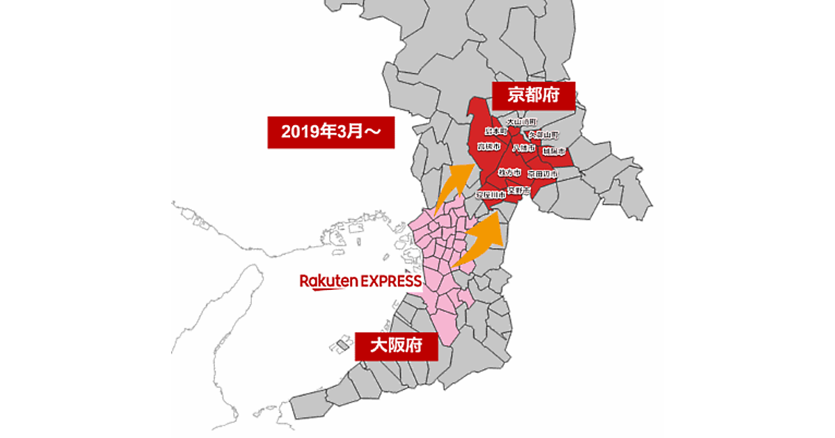 楽天は3月14日、独自の配送サービス「Rakuten EXPRESS」の対象地域を大阪府や京都府の一部地域へと拡大した。京都で「Rakuten EXPRESS」を行うのは初めて。配送エリアの人口カバー率は約20%に拡大したという。
