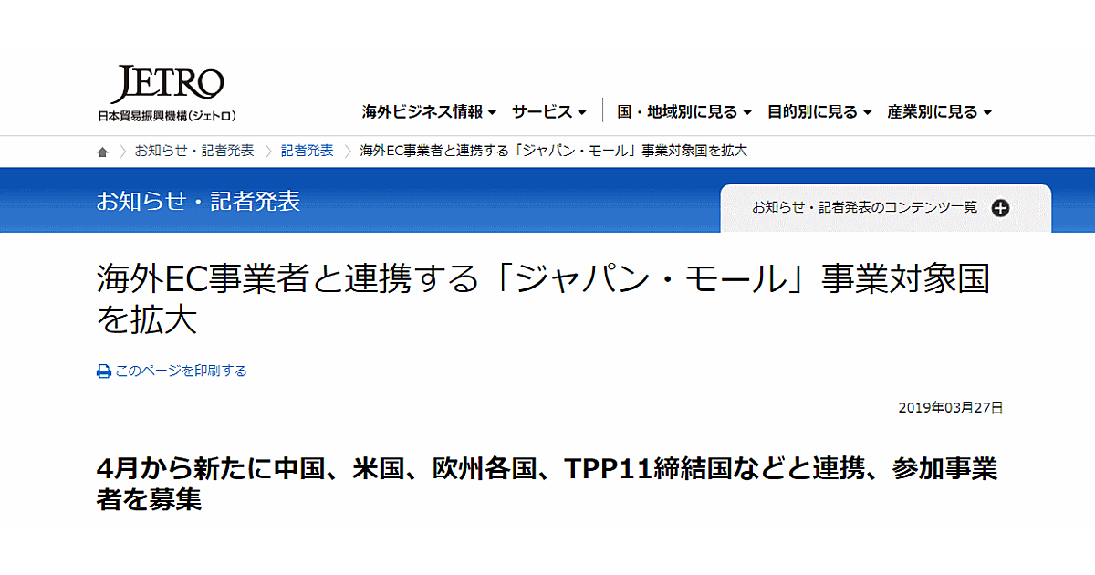 独立行政法人日本貿易振興機構(ジェトロ)は4月初旬、海外のECサイトを通じて日本産品の拡大をサポートする「ジャパン・モール」事業の2019年度参加者の募集を始める。