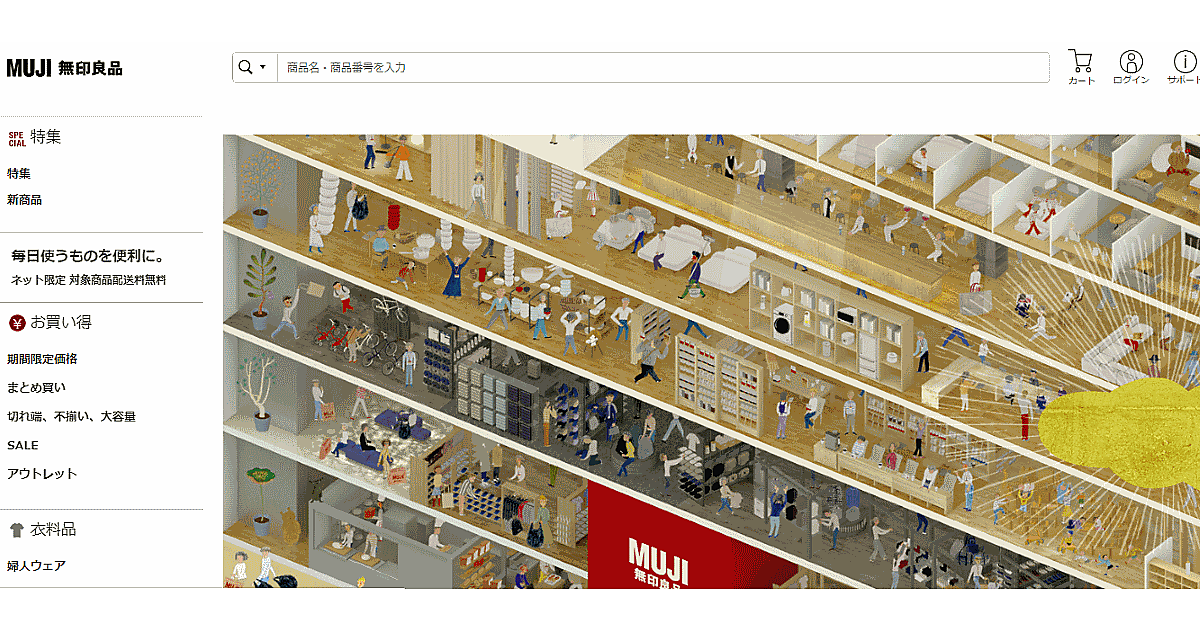 「MUJI passport」はレビュー投稿機能や店頭在庫の検索機能、店舗へのチェックイン機能などを備えており、オムニチャネル化のハブの役割を担っている。