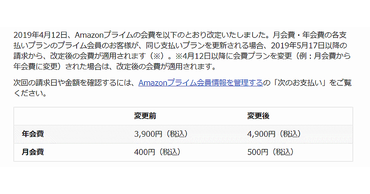 米国では当初、年会費79ドルで提供されていた「Amazon Prime」は段階的に値上げされており、2018年には年会費を99ドルから119ドルに引き上げている。なお、日本では2007年に「Amazonプライム」をスタート。会費の値上げは初めて。
