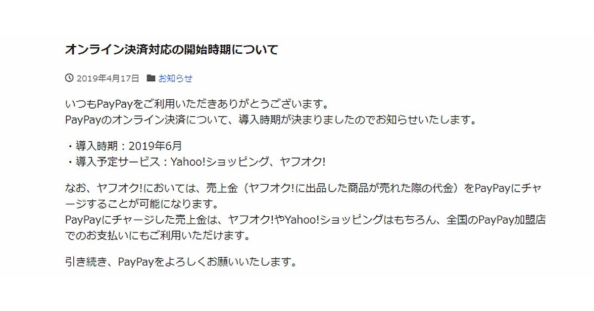 当初、「Yahoo!ショッピング」「ヤフオク!」のオンライン決済は2019年2月、「LOHACO」は4月に対応する予定としていたが、2019年1月に延期を発表した。