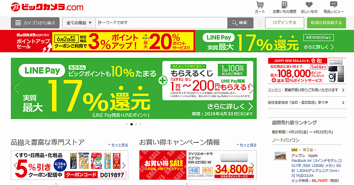 ビックカメラの2018年9月~2019年2月期(中間期)連結決算におけるグループのEC売上高は、前年同期比約25%増の517億円だった。EC化率は11.7%。通期ではEC売上高1000億円を計画している。