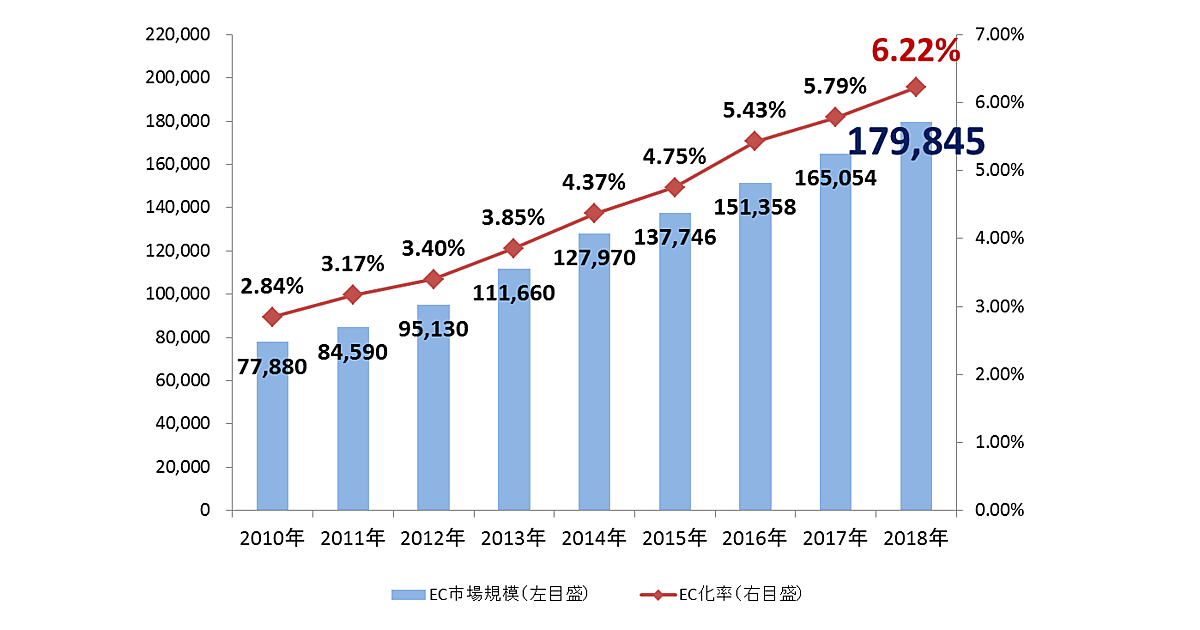 2018年における日本の消費者向けEC市場規模は前年比8.96%増の17兆9845億円。ECの浸透度合を示す指標であるEC化率も同0.43ポイント増加して、6.22%まで上昇した。