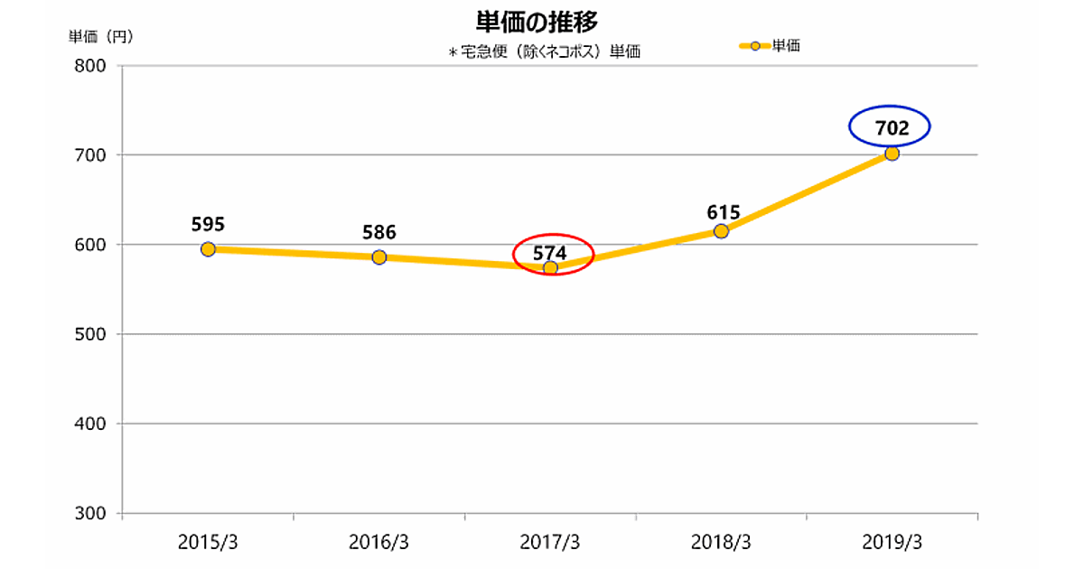 「ネコポス」を除いた「宅急便」(宅急便・宅急便コンパクト)の単価は同14.1%増の702円。2018年3月期からプライシングの適正化を推進しており、単価は2年で128円上昇している。