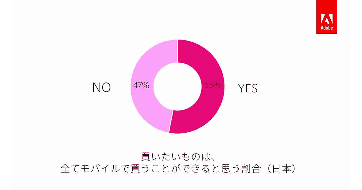 アドビがスマートフォンを所有する1000人の消費者に対し行ったモバイル利用に関する意識調査「Mobile Marketing Research 2019」によると、「買いたいものは全てモバイルで買うことができる」と53%が回答した。