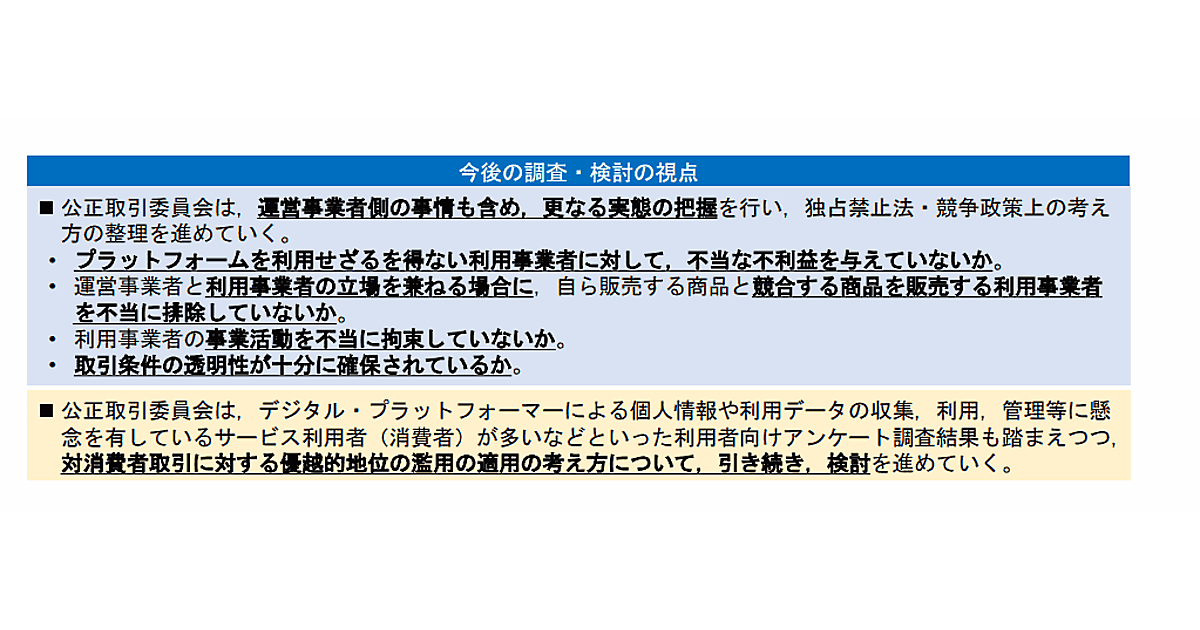 また、プラットフォーマーによるこれらデータの収集、利用、管理に「懸念がある」との回答も75%に上った。これを受け、「取引上優越しているか否か」「不当な不利益を与えているか」「競争への影響」といった観点から考えをまとめる。