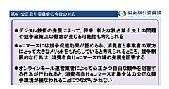 独禁法はこれまで事業者間取引において適用されてきた。事業者と消費者間の取引に適用例はない。ただ、「適用の可否でいえば、可能性が排除されるものではない」(公取委)としており、今後、独禁法上の新たな規制に対する考え方を整理する。ただ、公表時期は、「とくに明らかにしていない」(同)としており、政府が6月にまとめる成長戦略の実行計画とは異なるスケジュールで進める。