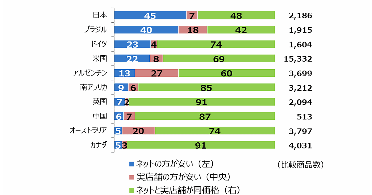 日本を含む10か国において、ネットと実店舗における価格比較を行った調査結果によると、日本は“ネットの方が安い”率が45%で最も高い。米国は22%。英国、中国はそれぞれ7%、6%。