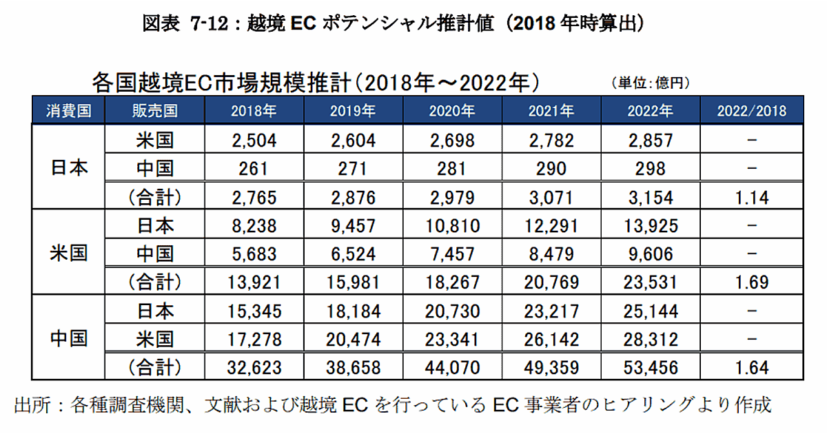 2018年の日本、米国、中国間における越境EC市場規模をベースに、2022年までの推移を想定した越境EC市場規模のポテンシャルを推計している。