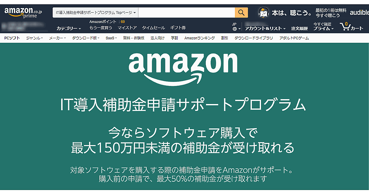 法人向け通販サイト「Amazonビジネス」や「Amazon.co.jp」で販売されている、クラウド型で提供されるソフトウェアなど数百種類のソフトウェアが補助金の対象。