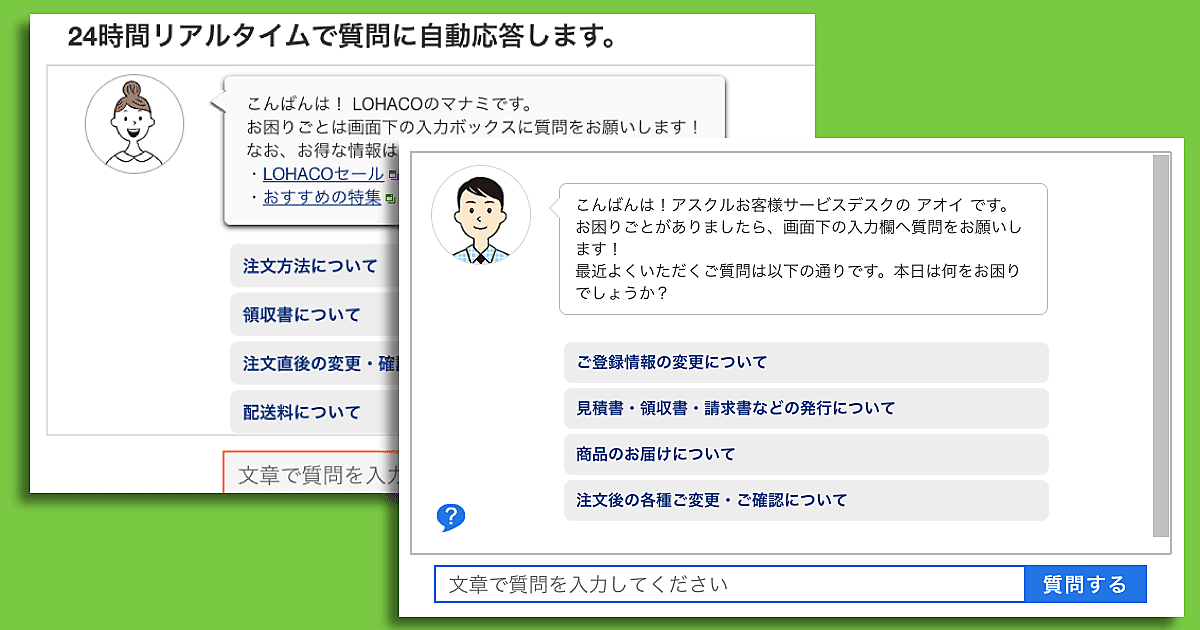 マナミさんがいるのは「LOHACO」のサポートページ、アオイくんと会えるのは「ASKUL」のヘルプページだ。