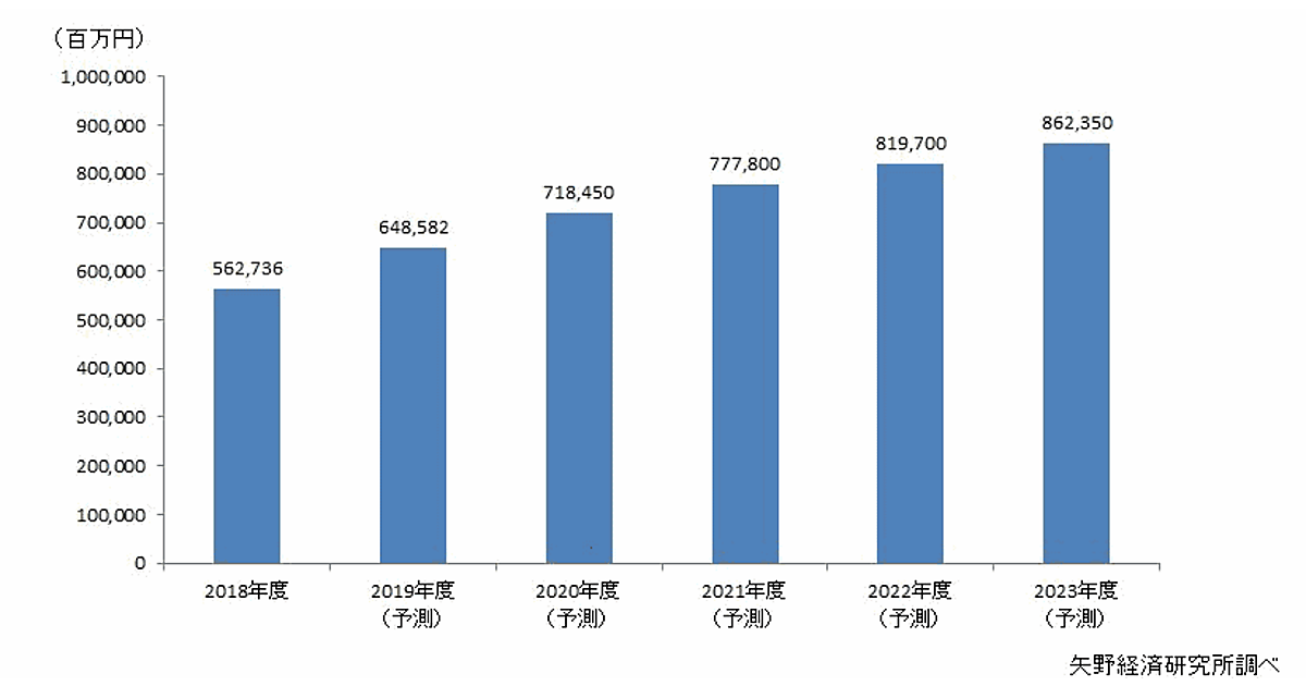 矢野経済研究所がこのほど公表した、サブスクリプションサービスの市場動向調査によると、2018年度の国内市場規模は5627億3600万円だった。今後5年間、市場規模は年率約5~15%で成長を続け、2023年には8623億5000万円に拡大すると予測している。