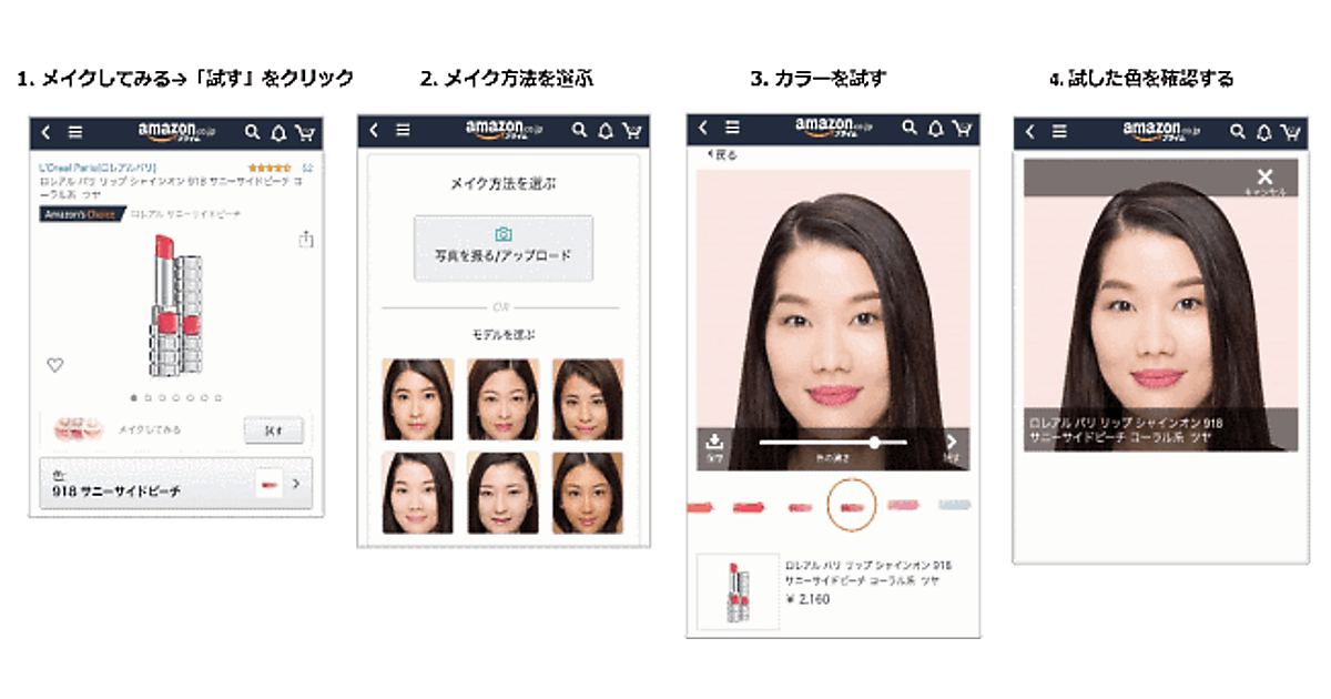 「バーチャルメイク」は、ロレアルグループ傘下のモディフェイス社が持つ人工知能(AI)技術と拡張現実(AR)技術を活用している。アマゾンジャパンによると、モディフェイスが開発したこの技術を導入するのは日本国内のECではアマゾンが初めて。