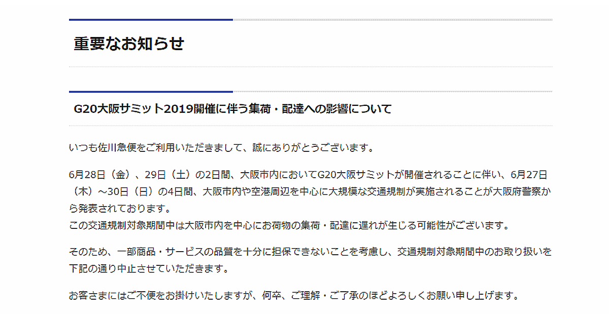 【G20大阪】佐川急便の配送・集荷への影響まとめ――大阪府などで飛脚クール便や指定日配達を中止