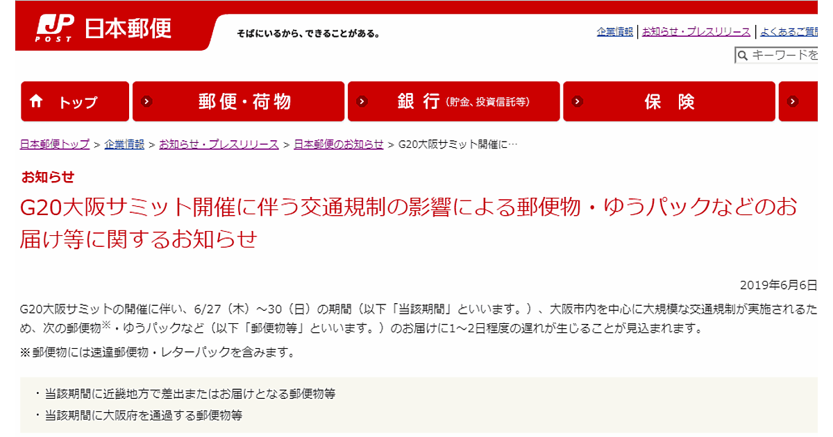 G20大阪サミットの開催に伴い、大阪市内を中心に大規模な交通規制が実施されるためだ。同期間はあらかじめ余裕を持って郵便物を差し出すことや、近畿地方への「保冷ゆうパック」の差し出しを控えるように呼び掛けた。