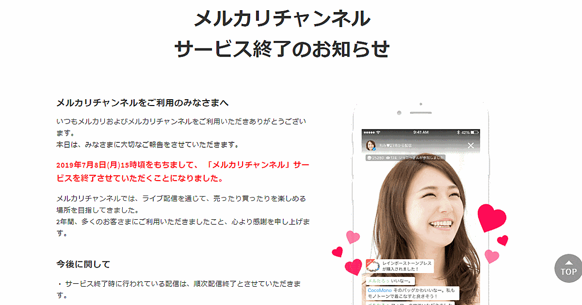 メルカリは6月7日、ライブ配信を通じて品物の売買が行える「メルカリチャンネル」を、7月8日午後3時ごろに終了すると発表した。法人向けに開放していたライブコマースサービスも同日配信を終了する。