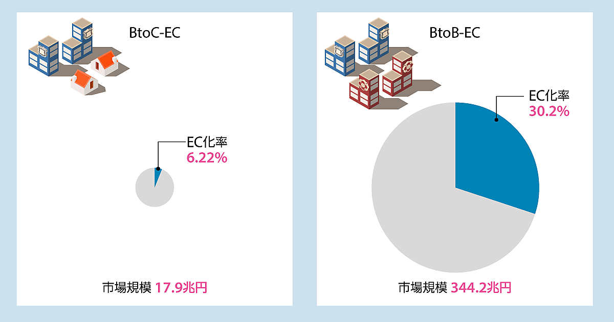ちなみに、BtoC-ECの市場規模は17兆9845億円(前年比8.96%増)、EC化率は6.22%(前年比0.43ポイント増)。BtoB-ECは市場規模で約20倍という圧倒的な規模とスピードでEC化が進んでいることがわかります。