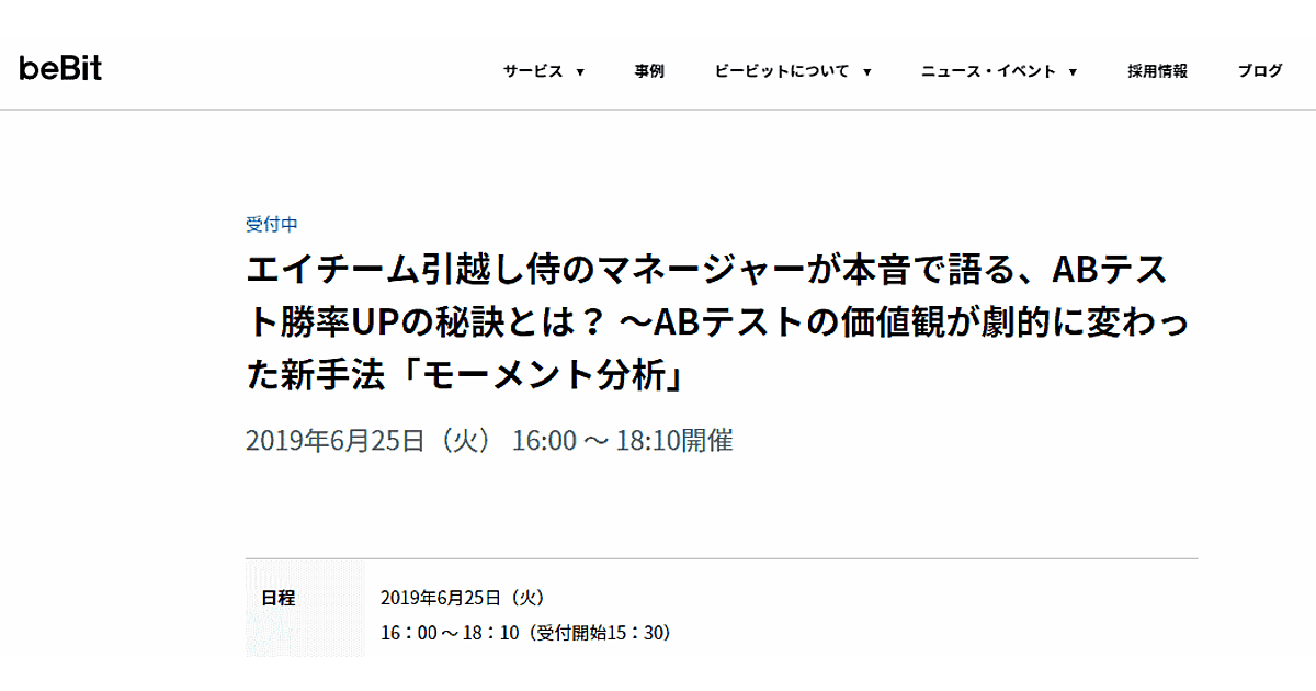 ビービットは、「エイチーム引越し侍のマネージャーが本音で語る、ABテスト勝率UPの秘訣とは? ~ABテストの価値観が劇的に変わった新手法『モーメント分析』」と題したセミナーを6月25日(火)に東京・千代田区で開催する。