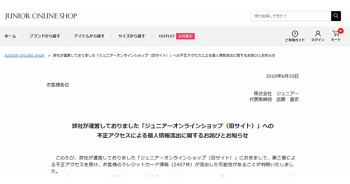 レディースファッションの製造販売を手がけるジュニアーは6月10日、リニューアル前の直営ECサイト「ジュニアーオンラインショップ」から最大2407人分のクレジットカード情報が流出した可能性があると発表した。