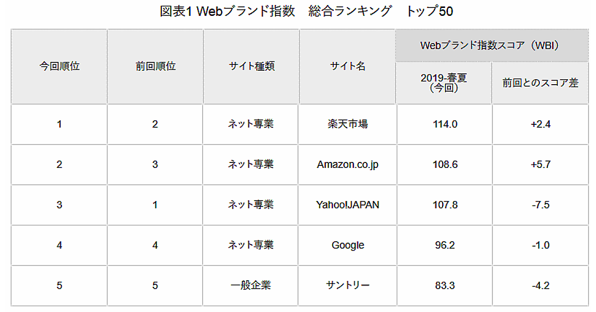 「楽天市場」が3年ぶりに1位、Amazonは2位。ネットユーザーが選ぶWebサイトのブランド力ランキング