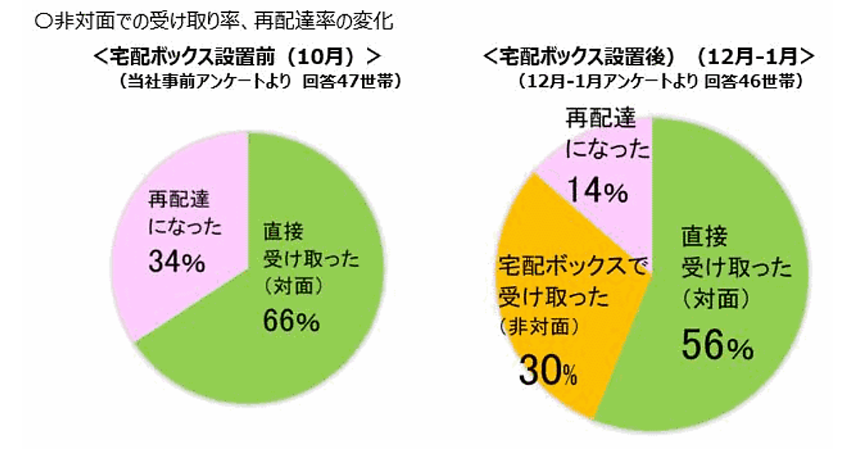 宅配ボックスを設置したら…非対面受取率は0%→30%にUP、再配達率は34%→14%に減少