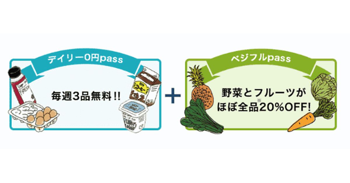 月額1280円(税別)を支払うと、毎週40種類以上の対象商品の中から3点が0円になる。ラインナップは牛乳やパン、ベーコン、ハム、ヨーグルトなど、冷蔵庫に常備しておきたい食品を集めた。1回の注文につき、3点を月に4回注文した場合、毎月12点が0円になる。