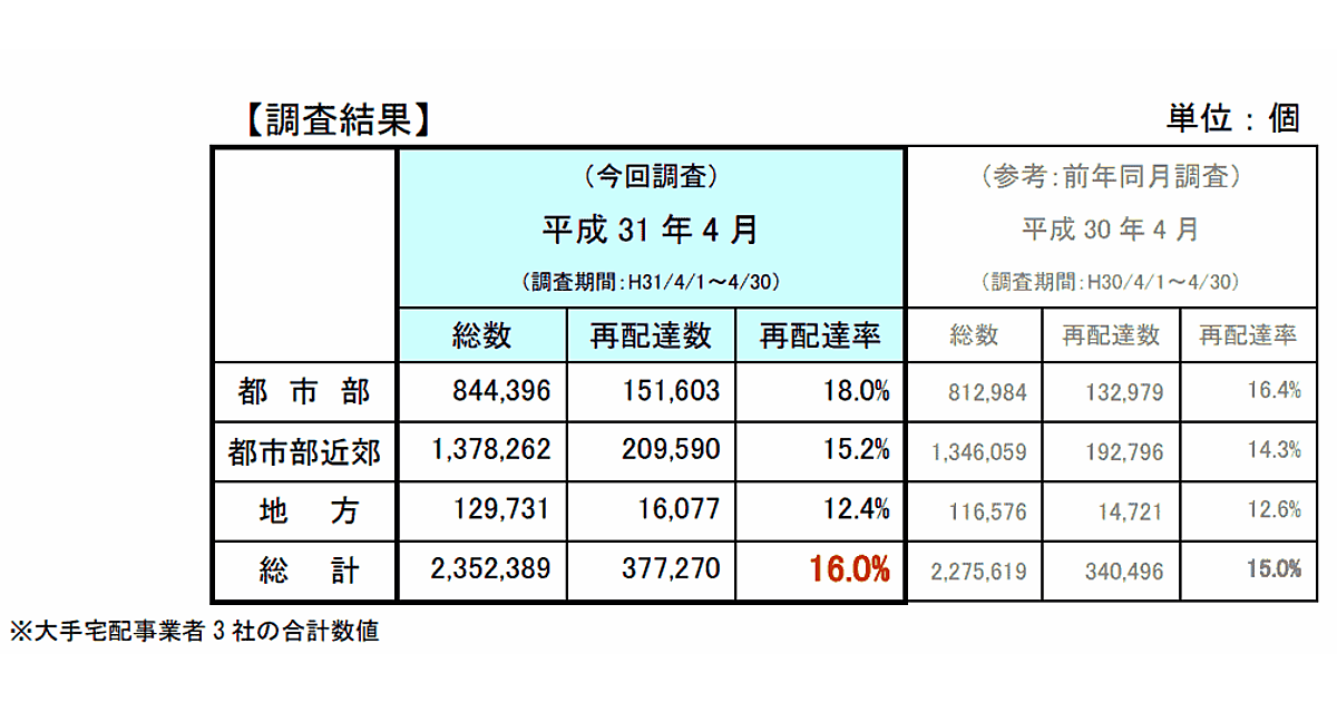 2019年4月の調査結果によると、対象エリアにおける宅配便の総取扱個数は235万2389個。このうち再配達数は37万7270個だった。