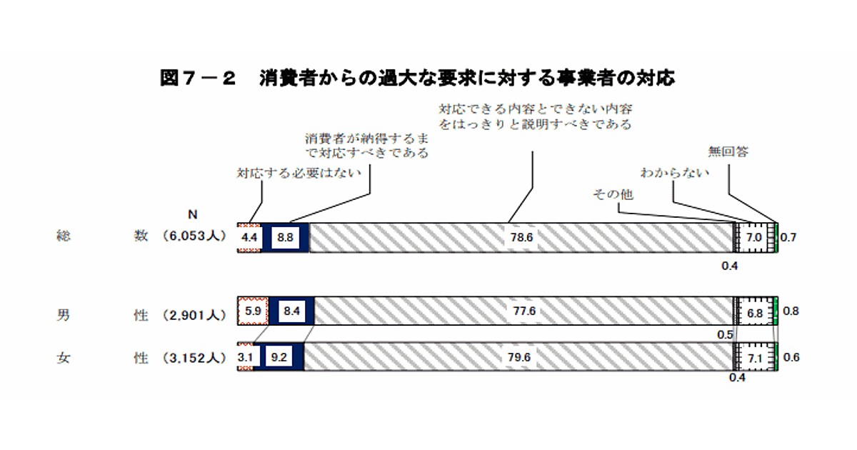 消費者からの過大な要求に対して、事業者はどのように対応すべきかを聞いたところ、事業者は「対応できる内容とできない内容をはっきりと説明すべきである」と回答した人の割合は78.6%だった。「消費者が納得するまで対応すべきである」が8.8%、「対応する必要はない」が4.4%。