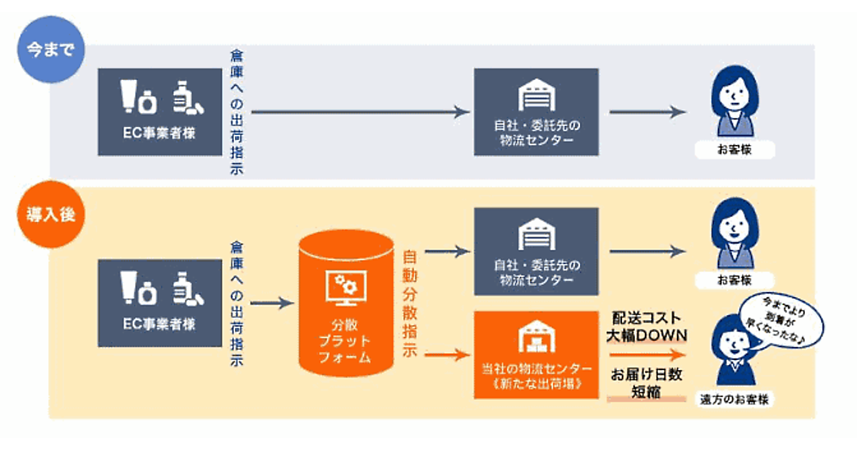 国内に複数の物流拠点を持つことで、商品を注文した顧客の配達先に近い拠点から出荷することで、配送距離が近くなり配送コスを削減することができる。エリアによっては、顧客へのお届け日数も短縮できるようになる。
