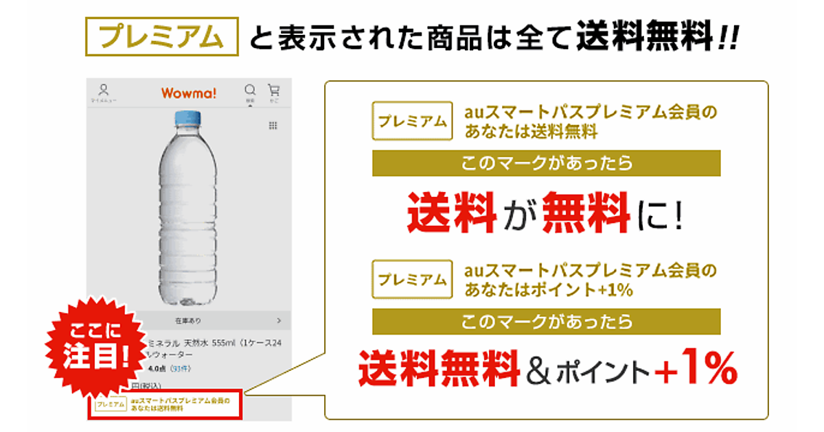 送料はKDDIとauコマース&ライフ(aCL)が負担する。プレミアム特典の対象は「au Wowma!」内のプレミアムマークが付いた商品。プレミアムマークの付く商品は、注文から発送までの期間や店舗品質の基準などを満たした店舗が提供するものが対象となる。