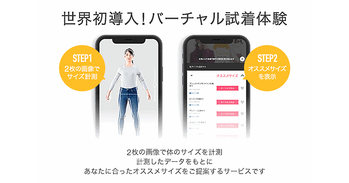 ユーザーごとに最適なサイズをレコメンドする「オススメサイズ」表示も同時にリリースし、一目でフィットするサイズが分かる新たな買い物体験を提供する。まず、iOSアプリを利用する一部ユーザーにサービスを展開。ユーザーはスマホの画面上で、自分のサイズとアイテムのサイズを比較することができる「バーチャル試着体験」ができるようになる。